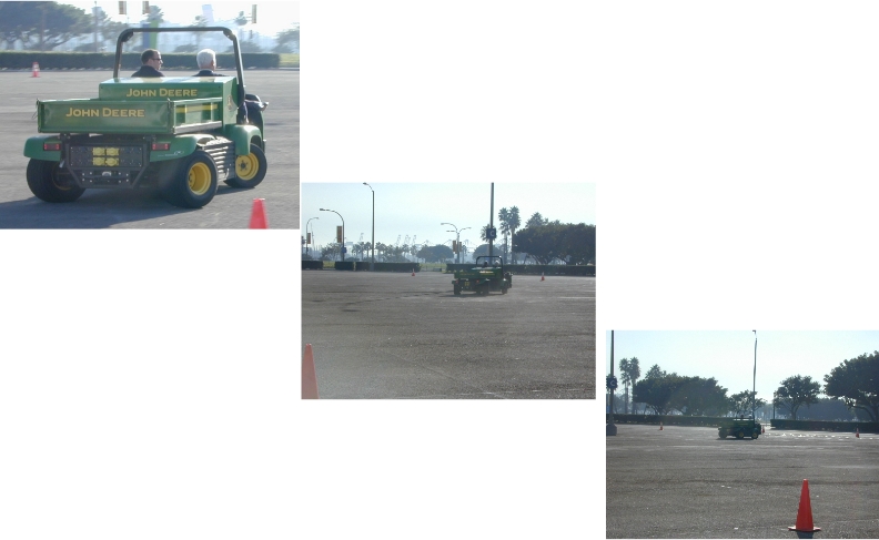 [In the pictures above, look carefully at how the front and rear wheels turn to produce the zig-zag direction motion of the vehicle. “Crab Steering”. A John Deere representative was driving, because driving it requires some getting-used-to. Note that this is a Fuel Cell Vehicle, powered by Hydrogenics.]